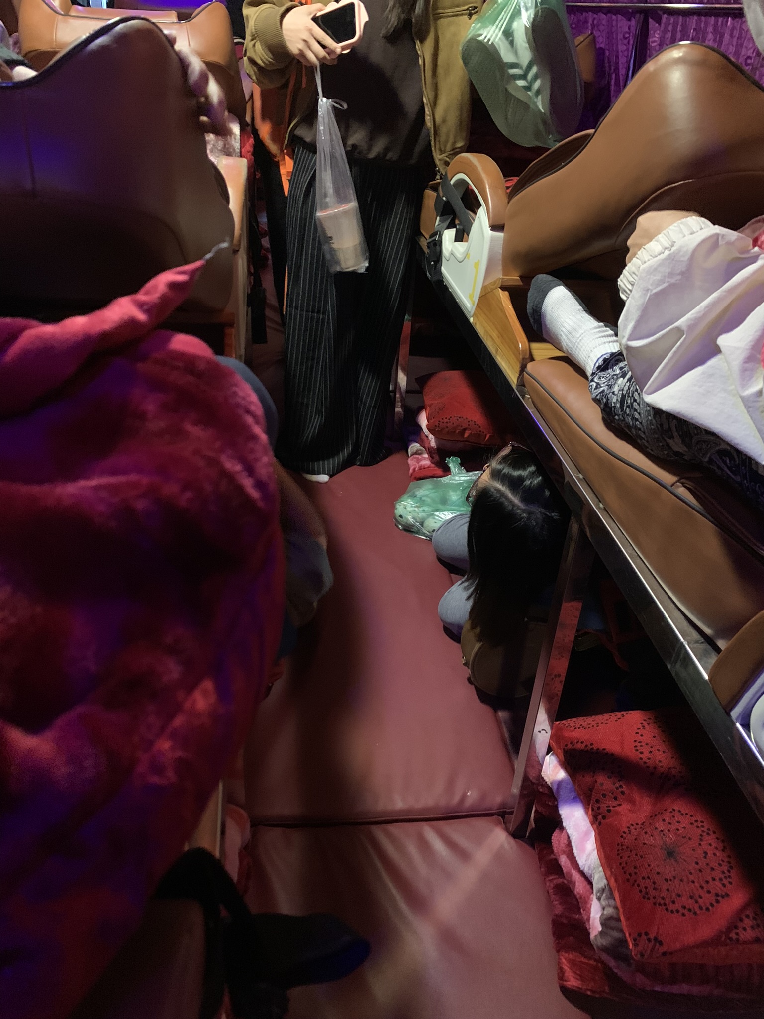 19h40, nó chính thức bước lên xe, nếu được nhìn mặt lúc đó chắc sẽ thấy sự bất ngờ trên khuôn mặt vì khoảng cách giữa tầng trên và tầng dưới thấp đến kì lạ khoảng 80cm vừa đủ để nằm thò đầu ra nếu bạn nằm ở tầng dưới, chỗ nằm hơi hẹp nếu so sánh xe giường nằm Phương Trang, Thành Bưởi nó thường hay đi…ở đây dường như khách chỉ báo nhà xe đón ở đâu, mấy người, sau khi lên xe mới thu tiền, nhờ vậy nó biết giá 400k mỗi đứa. Xe có dừng 1 trạm duy nhất mà nó không thể nhớ được vì lúc đó đang ngủ say.