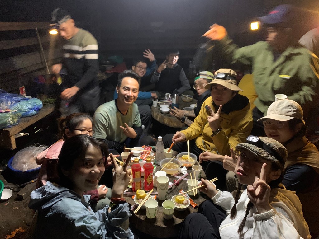 Mặc kệ ai đó đang lắc chân, nó vẫn cuộn mình trong chăn biển thủ như một con nhộng khổng lồ níu kéo thêm chút ấm áp. Nghĩa lại nó đang đi tour mà sao theo ý được, ngao ngáo rời khỏi chăn, nhìn qua chỗ nằm đối diện mới biết anh chị nhóm đó đã ăn xong và rời đi leo núi luôn rồi, đệch mới 4h45 sáng, chẳng lẽ giờ này là trễ rồi sao. Bên ngoài trời vẫn tối hù, sương mù dày đặt, trong trạng thái lâng lâng của cơn buồn ngủ, nó đánh răng, rửa mặt sau đó di chuyển nhanh tới khu nhà bếp, các anh đã chuẩn bị xong đồ ăn rồi, tuyệt vời. Sáng nay mỗi đứa tối thiểu một tô mì với thịt và bắp kèm 1 ly cà phê sữa nóng, quá đủ cho buổi sáng.