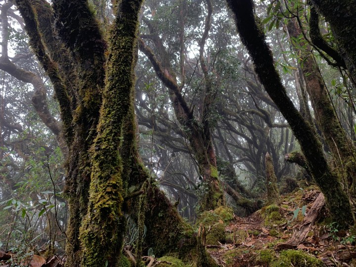Càng lên cao càng lạnh, càng gần đỉnh núi rêu bám càng dày, rừng cổ thụ rêu bám từ trên xuống dưới, kèm theo sương mù mờ ảo 12 giờ trưa mà ngỡ đâu đang chập chờn chạng vạng. Nếu nói lạc vào thế giới thần tiên thì cũng đúng, nhưng nó không còn đủ tâm trạng để cảm nhận được vẻ đẹp này nữa khi chân nó đình công, giờ chỉ muốn biết cái cột mốc ở đâu.