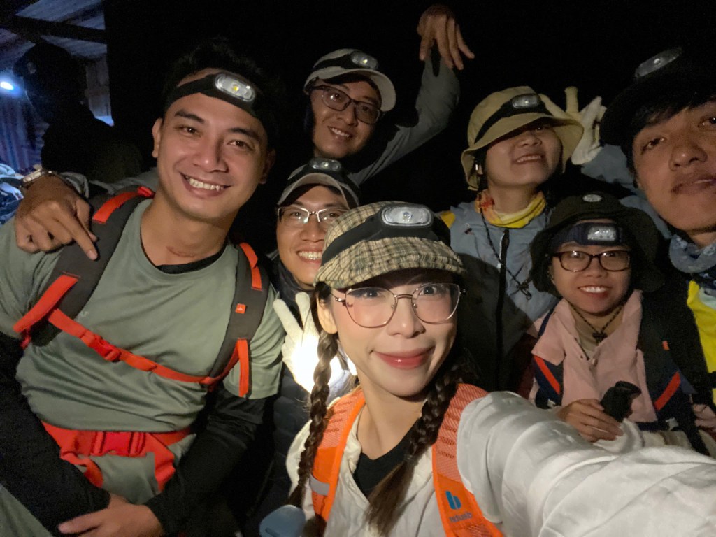 5h50 sáng, mọi người đã tập hợp đầy đủ trước lán, trời vẫn còn tối nên ai cũng mang đèn pin trên đầu.