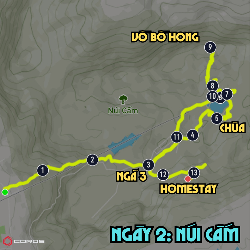 Ngày xưa bà con lên núi làm rẫy, mót xoài nhiều lắm nhưng giờ hổng ai đi nữa, những con đường thiếu dấu chân người cũng dần biến mất. Thằng em tôi cũng không biết con đường mòn giờ đi thế nào nữa, lựa chọn duy nhất để chúng tôi có thể đi bộ lên núi là đường chùa. Dù rằng đỉnh núi Cấm cao 705m nhưng quãng đường tôi ghi nhận từ khi bắt đầu tới khi đặt chân vào homestay ở lưng chừng núi là hơn 13km, tính ra cũng nhiều đó chứ.