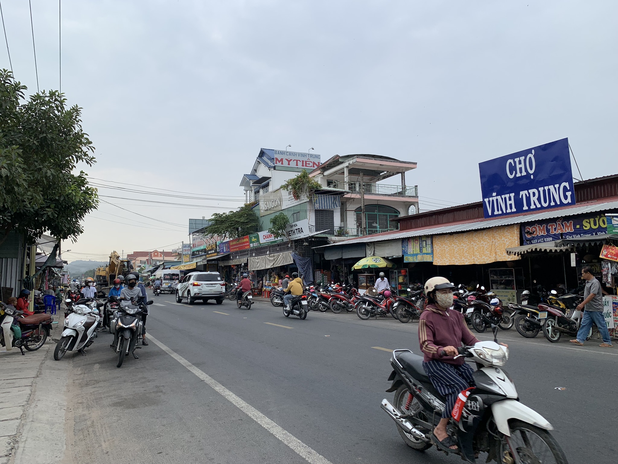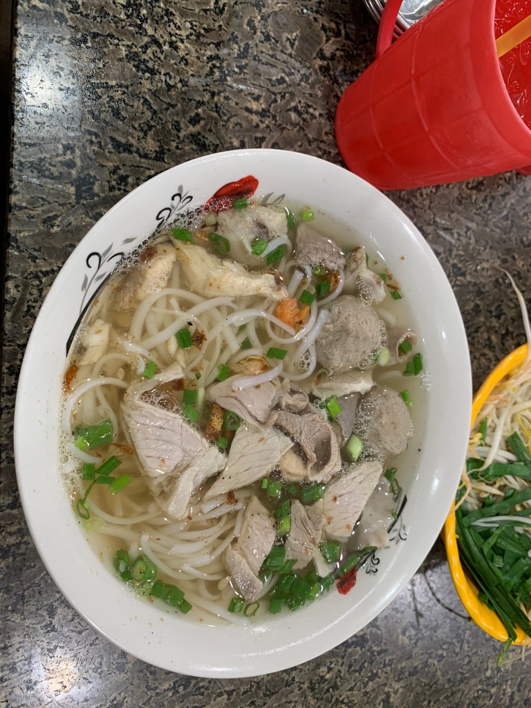 Chúng tôi rời đi ngay khi đồng hồ báo 7h đúng, chạy xíu tới chợ Vĩnh Trung, có 2 sự lựa chọn cho buổi sáng, đều là must-try: Bánh Canh và Cháo Bò; chúng tôi chọn Bánh Canh. Bánh Canh Vĩnh Trung có tiếng đã lâu, cọng bánh canh nhỏ hơn bánh canh bình thường khá nhiều, nước dùng ngọt thanh được hầm nhiều giờ bằng thịt xương rau củ; topping thì có thịt, cá, bò viên, tôm, giò heo…