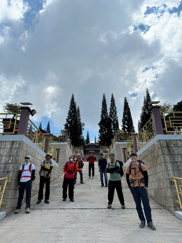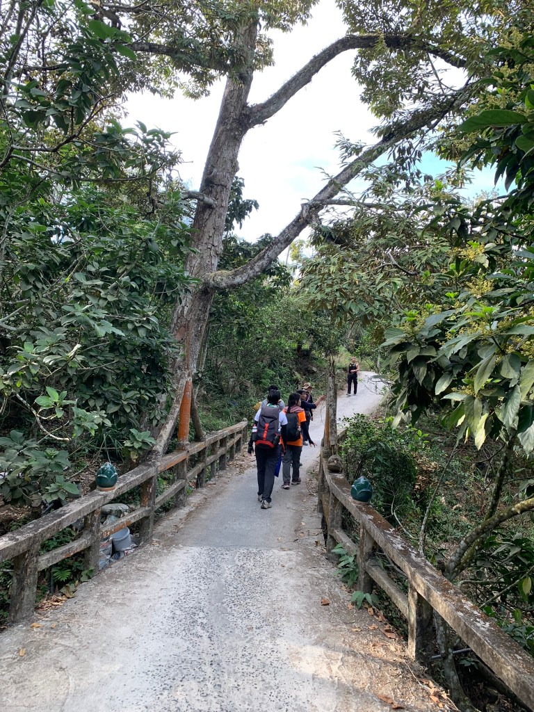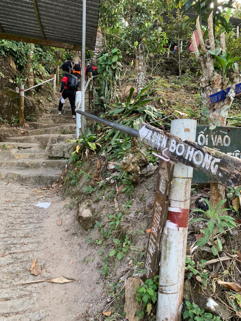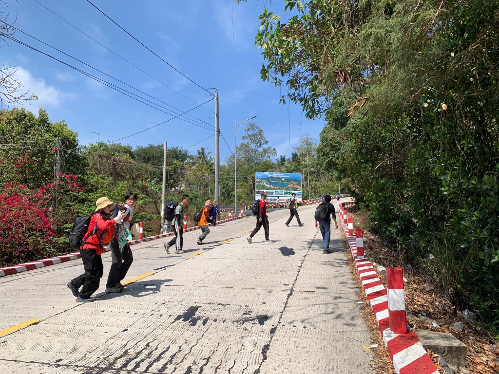 2h chiều nhóm chào thầy và bắt đầu đi tiếp lên đỉnh Vồ Bồ Hong, nhưng vẫn được phát thêm mấy khúc bánh tét mang đi. Có sẵn đường nhựa tới đỉnh luôn nên nếu ai không đi bộ được cứ lên xe cô chú chở lên, tiếng kèn kêu inh ỏi lại quay trở lại và mức độ còn kinh khủng hơn khúc xe máy di chuyển lên núi. Đi bộ mà thấy nguy hiểm quá, cứ né xe liên tục.
