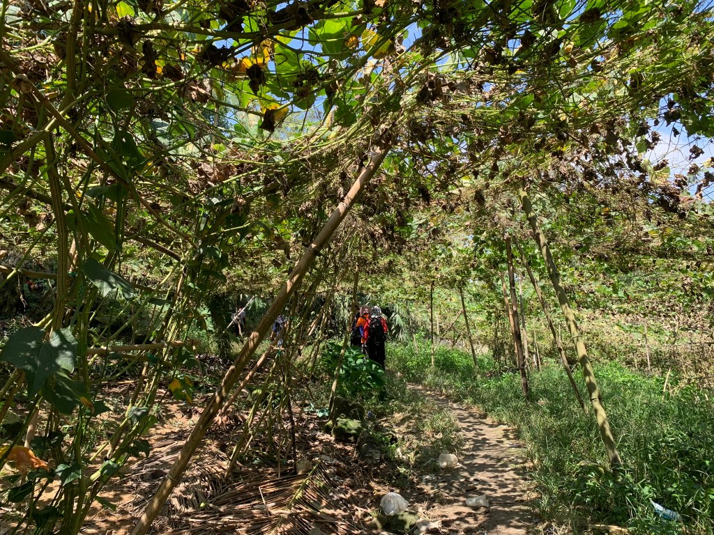 Băng qua đường hướng về phía homestay để đồ đạc nhẹ người rôi thong dong lên núi tham quan…nhóm tôi rẽ nhầm, rẽ phải vào homestay thì chúng tôi rẽ trái lên thẳng núi…gần tới chùa thì homestay mới nhắn mấy anh đi lộn đường rồi…vác balo đi luôn, có vẻ trời phật muốn tụi con chân thành chút. Có lẽ chúng tôi lạc một phần con đường đẹp quá, đi dưới những giàn su, ánh nắng giờ chỉ còn lại những chấm nhỏ rơi lã chã trên con đường đất.