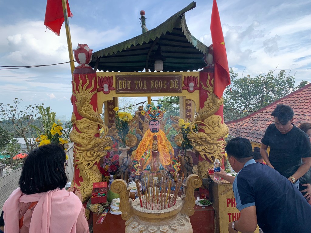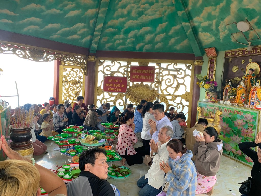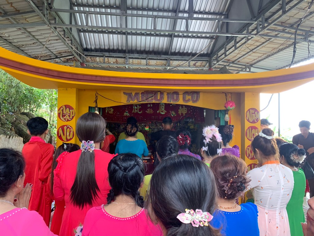 Ngồi nghĩ ngơi chút cả nhóm di chuyển xuống núi, trên đường thì thấy mọi người tụ tập múa hát… cuối cùng cũng tới khoảnh khắc này, xứ sở thần tiên. Tôi cầm điện thoại chạy tới tác nghiệp liền, 10 cô gái mặc áo dài nhiều màu sắc rất đẹp múa hát trước miếu 10 cô, xung quanh rất đông bà con đang theo dõi, lúc tôi đến mọi người đang xã điển, tới muộn quá rồi. Điển là kiểu nhận thông tin lời chỉ dạy từ các bậc ở trển, tôi hiểu có 3 dạng là hạ điển, trung điển, thượng điển… tùy theo tầm và khả năng của người nhận điển, ví dụ ngày mai mưa thì người nhận điển hôm nay có thể chia ra: linh cảm mai mưa (hạ điển); thấy trời mưa (trung điển); trời mưa lúc nào ra sao lớn nhỏ rõ ràng hình ảnh (thượng điển). Lên tới xứ sở mà được xem hơi ít, thôi để đợt khác vậy.