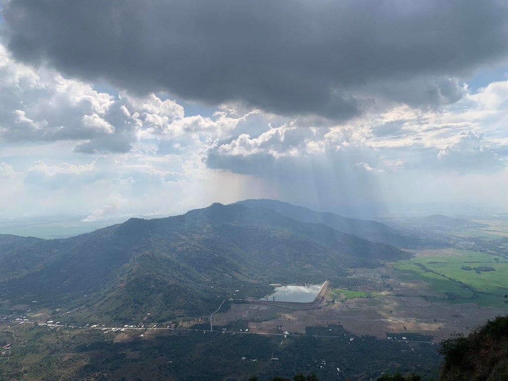 3h chiều chính thức lên đỉnh núi Cấm, chẳng thấy cột mốc nằm đâu chỉ thấy điện cửu huyền trăm họ, điện ngọc hoàng, Diêu Trì Thánh Mẫu và chư vị Sơn Thần; hỏi ra mới biết cột mốc có nhưng đang làm chỗ để cho bà con cô bác bán đồ trên đây rồi, giờ không biết đang nằm ở quán xá của cô chú nào. Tôi đi bộ lên điện trăm họ, mọi người đang dâng lễ đông nghẹt nên vòng ra sau, những vệt nắng xuyên qua mây rơi xuống cánh đồng thốt nốt. Tôi lấy điện thoại ra nhưng không thể nào lưu được vẻ đẹp này được. Khung cảnh biến mất khi ánh nắng mặt trời quay lại, chỉ 5 phút. Sao những điều đẹp đẽ chỉ chớp nhoáng trong khoảnh khắc thôi; bình minh, hoàng hôn; cuộc đời của chúng ta có như vậy không. Leo núi mà tâm lạ quá.