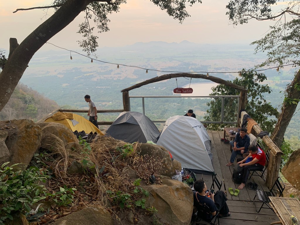 Homestay chúng tôi ở lại là Thác Suối Tiên có view rất đẹp, thông thoáng, rộng rãi có thẻ nhìn xuống những cánh đồng bên dưới, chỉ là không thể nhìn thấy bình minh và hoàng hôn thôi. Hiện tại có 2 nhóm khách khoảng 15 người ở lại trong các căn phòng kiểu bungalow, họ đang chuẩn bị đồ ăn để nướng cho buổi tối; tụi tôi chỉ thuê chỗ cắm, lều tự mang theo, 9 đứa 3 lều quá hợp lý.