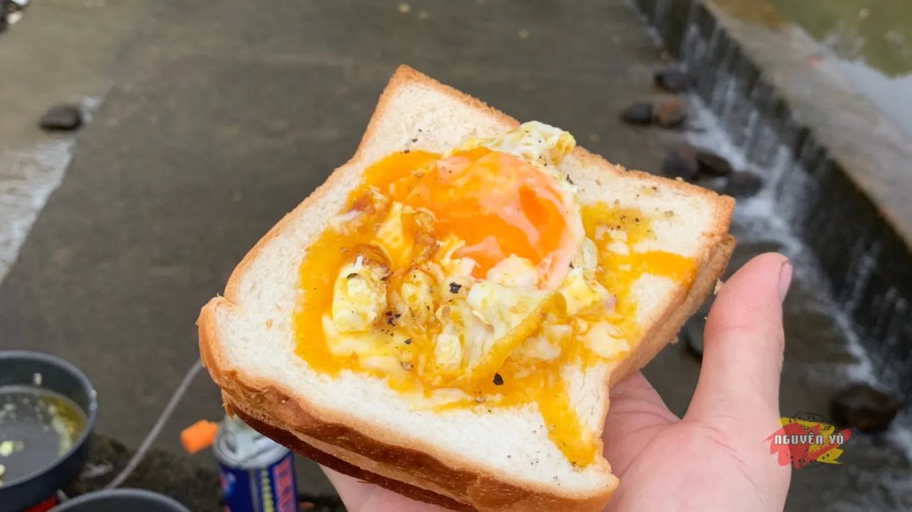 Menu sáng này cũng có sự cải tiến, trứng gà chiên, sốt muối tiêu xanh, tương ớt, sandwich ăn kèm cây xúc xích nhỏ. Vừa ngắm cảnh vừa ăn cũng chill phết.