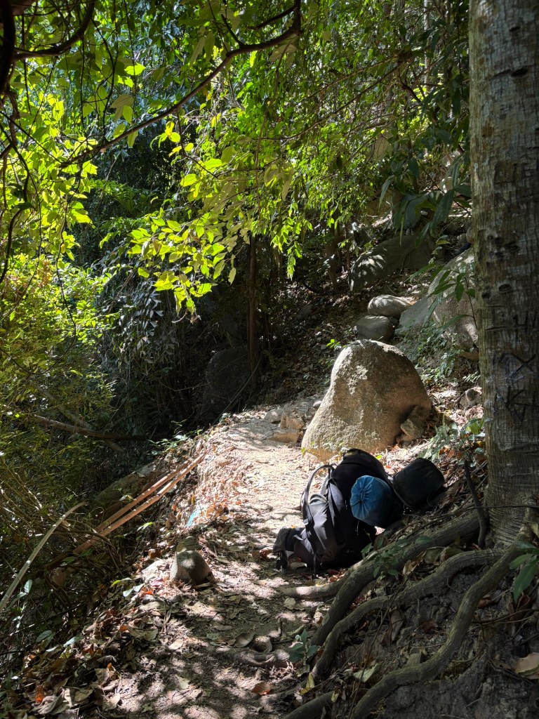 Ấn tượng đợt này là cái cây lâu năm bị sét đánh ngã, cả thân rơi xuống đè chắn mẹ hết con đường, chừa lại cái lỗ nhỏ xíu để đi xuống, nó hụt chân xém tý quắn quéo rồi. Đi được ½ núi tới trạm dừng chân đầu tiên, nó quất ngay chai review và tô mì trứng, coi như là ăn trưa luôn rồi; nghỉ ngơi ngắm chó chút, tụi nó tiếp tục leo xuống.