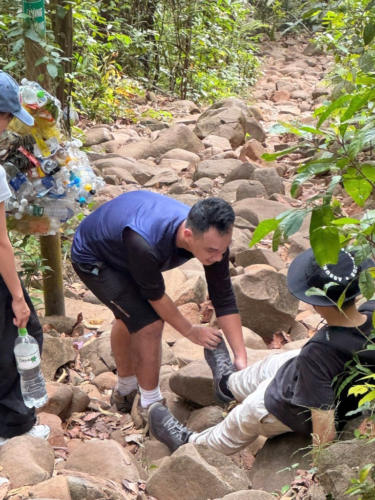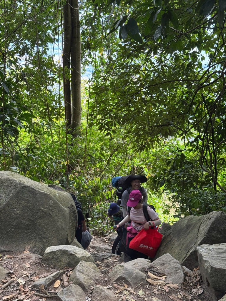 Đường chùa dài hơn đường cột điện (4.86km so với 3km), địa hình chủ yếu là đá, dùng tay để bám, dùng mông để lết, dùng chân để chạm khá nhiều; mấy bạn trong nhóm phát biểu cảm nghĩ thì hôm qua leo lên kiểu tập leg day còn hôm nay được tập toàn thân cardio nên các bạn khá thích nên thêm những lời như sau “nếu hôm qua leo lên đường này thì đây sẽ là lần cuối anh em mình gặp nhau, cắt đứt quan hệ luôn”. Ơ hay, có những con đường khó khăn nên người ta mới trân trọng những con đường bằng phẳng đúng không em.
