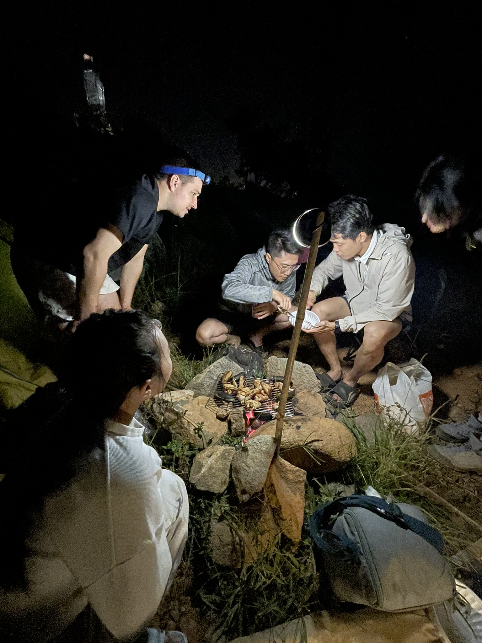 Nó được mọi người đưa cầm một bịch đồ bí ẩn, chỉ bí ẩn với mỗi mình nó vì nó không biết trong đó là gì. Cứ ngồi nghĩ mệt là nó quăng như con ghẻ; đi được hơn tiếng thì nó giở ra bên trong là gì: mấy bịch sandwich ăn sáng, khoai lang, và 20 cái trứng gà, có thêm vài vệt nước nhớt nhớt nhiễu ra màu vàng của trứng. Chết mẹ, chắc bể hết rồi. Thấy vậy mọi người chia nhau ra tách bịch ra vì trứng bấy nhầy trong bịch…haizz, sáng mai ăn gì đây? Thôi  lên đỉnh rồi tính tiếp, không được thì qua bên khu du lịch ăn, chỉ sợ thiếu tiền thôi.