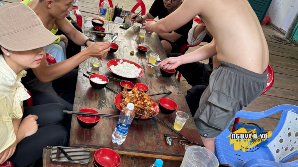 Nằm võng nghỉ ngơi chút khoảng 3h cả nhóm xuống tới chân núi và di chuyển tới chợ Hải Sản, quay lại trung tâm đảo sau đó tiếp tục di chuyển khoảng 2km thì tới chợ hải sản, ở đây, cửa sau thì dành cho tàu bè neo đậu, mở toang, còn cửa chính thì là đường chợ, đường chỉ rộng khoảng 2m và được che bằng bạt từ đầu đường tới hết chợ luôn. Tôi thấy chợ này là chợ chính lớn nhất hòn đảo, mọi thứ đều có thể mua ở đây. Mọi người tản ra mua hải sản, mua thịt xiên, mua nước chấm, mua rau, trái cây, vỉ, đũa, mọi thứ có thể để nấu nướng tối nay và cũng không thể quên một chút rượu cho ấm áp biển đảo.