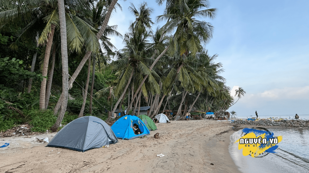 Có Tân đi công nhận đỡ mệt cho nhóm, lên hết rồi chỉ đi theo thôi. Cả nhóm di chuyển đến Bãi Bàng, khi đã đi hết đảo phải công nhận Bãi Bàng này là bãi biển đẹp nhất cả hòn đảo, vibe tropical island đúng nghĩa, những hàng dừa vươn mình nghiêng về phía biển. Tụi tôi cắm trại bên bãi biển này tối nay, anh chủ bãi nói rằng: “mấy chú Sài Gòn ra đúng không”, “sao anh biết”, “chỉ có mấy bạn Sài Gòn mới thích kiểu này” có một sự quy chụp nào ở đây không, thôi kệ dù sao thì cắm lều bên bãi biển đẹp nhất đảo với giá 150k một lều bao luôn chỗ vệ sinh kèm nhờ vả, xin xỏ thì quá ổn áp rồi.