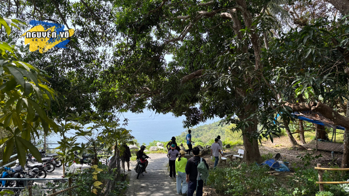 11:30 nhóm cũng tới đỉnh, tìm cột mốc đỉnh thì không thấy chỉ có một tảng đá lớn vươn ra có thể nhìn toàn cảnh biển cả từ trên cao mà thôi. Choáng, tôi cứ bị choáng vì cái đẹp, cái cảm giác nhỏ bé của chính bản thân khi đứng trước những điều vô tận. Con tàu cao tốc đang tiến vào đảo chỉ còn là một điểm nhỏ pixel lướt qua, những cột điện vượt biển từ đất liền nối nha thành một hàng kéo dài rồi chìm mất vào đường trời và biển. Từ vị trí này tôi có thể thấy Bãi Bàng, những hàng dừa vươn mình ra biển, nơi chúng tôi ở tối nay.